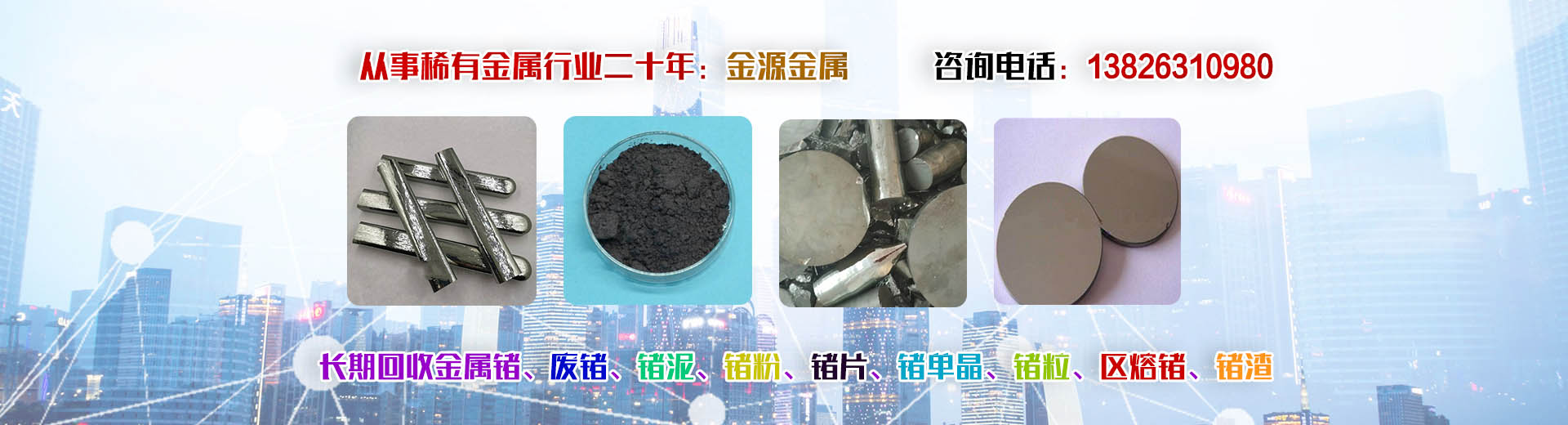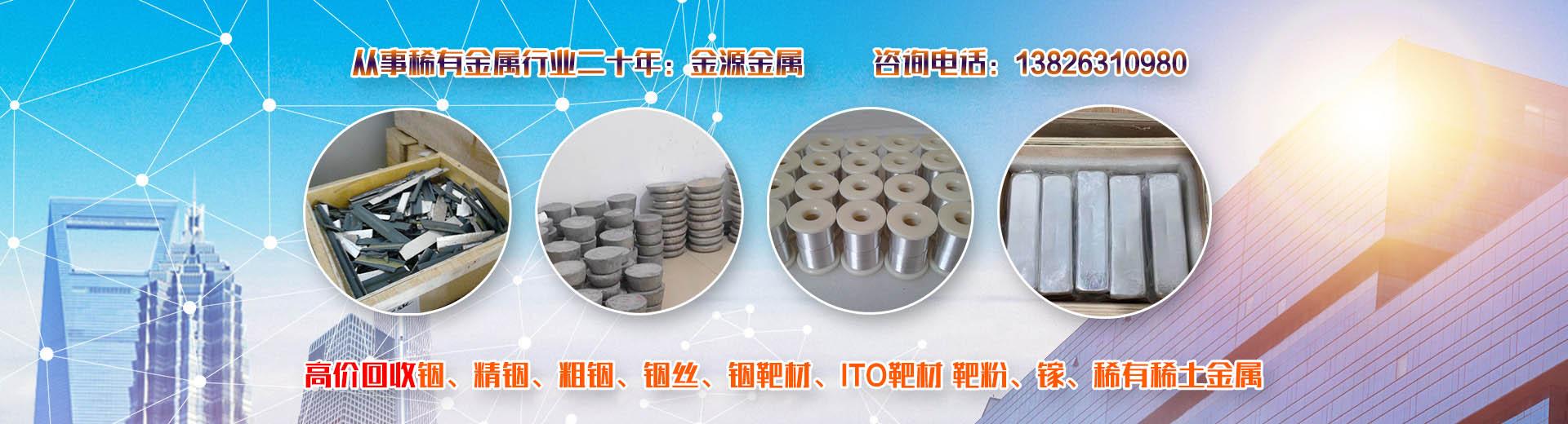 韶關市金源金屬材料有限公司坐落于中國廣東省韶關市,長期收購回收銦、精銦、粗銦、銦絲、銦靶材、ITO靶材靶粉、回收金屬鍺、鍺錠、鍺粉、鍺片、回收鍺單晶、單晶鍺、鍺粒、區熔鍺、工業(yè)鍺、廢鍺、鍺泥、鍺渣、二氧化鍺回收、四氯化鍺、有機鍺、銀、純銀、銀靶材、高價收購回收ITO廢靶、回收廢銦、廢銦沙、廢銦渣、回收粗銦、廢銦絲、廢銦珠、廢銦箔、廢銦棒、收購銀焊條、銀焊絲、導電銀膠、金屬鎵、硝酸鎵、氧化鎵、三氯化鎵、氯化鎵,供應及回收氧化鎵、氫氧化鎵、碲化鎵,硒化鎵,銦粉,氧化銦、氯化銦、硫酸銦、硫化銦、醋酸銦、氫氧化銦、硒化銦,碘化銦,銅銦鎵硒,含金、銀、銦、銠、鈀、鎵、鍺等稀有貴金屬材料,稀土金屬材料、氧化鏑、氧化镥、氧化鋱、氧化鐠釹等回收。